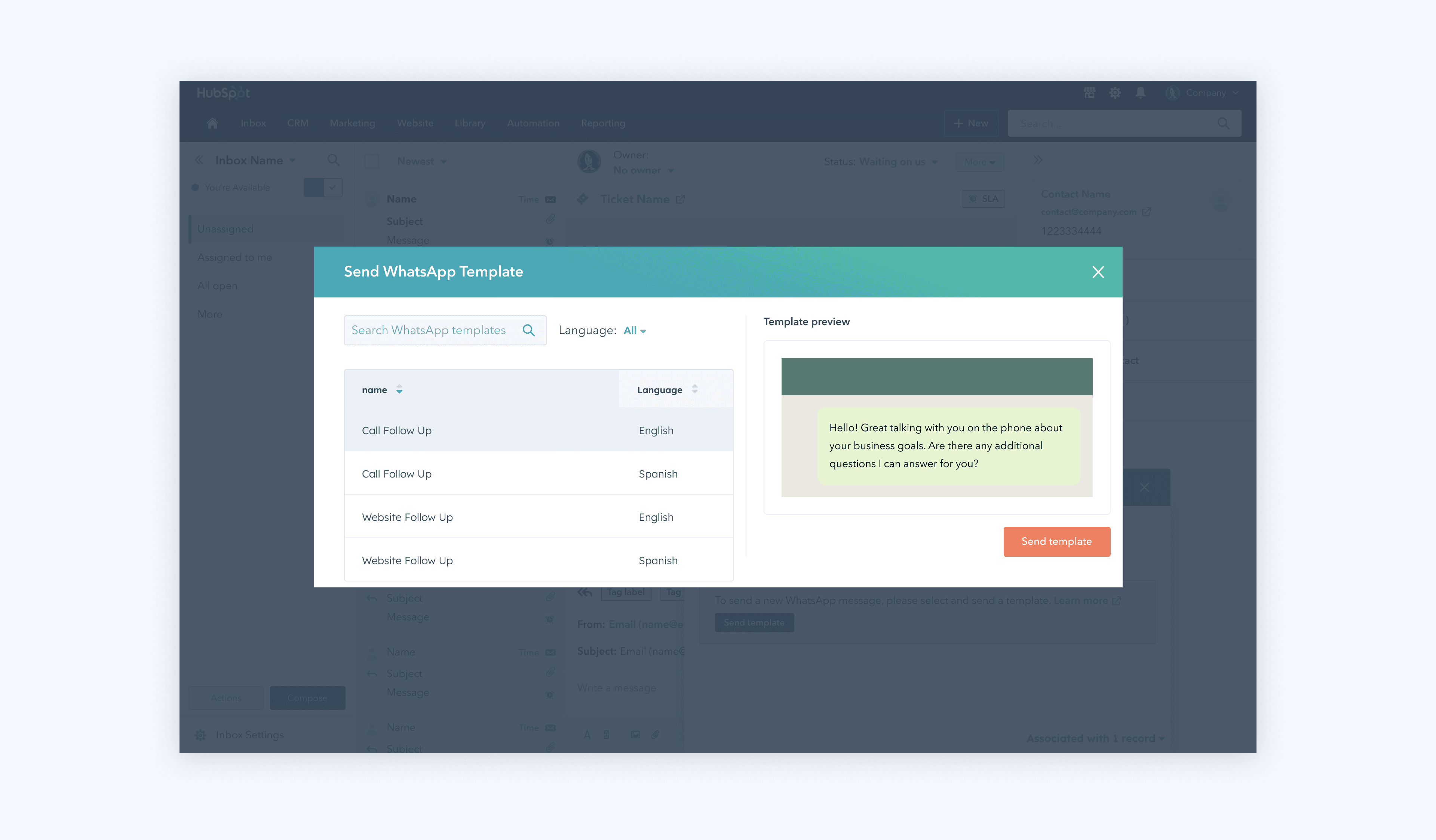 When composing a message in the Inbox, users start by clicking Compose, which opens a window to select both the recipient and the WhatsApp account they want to send from. From there, they can choose Send template to browse and select a pre-approved message template for their outreach.