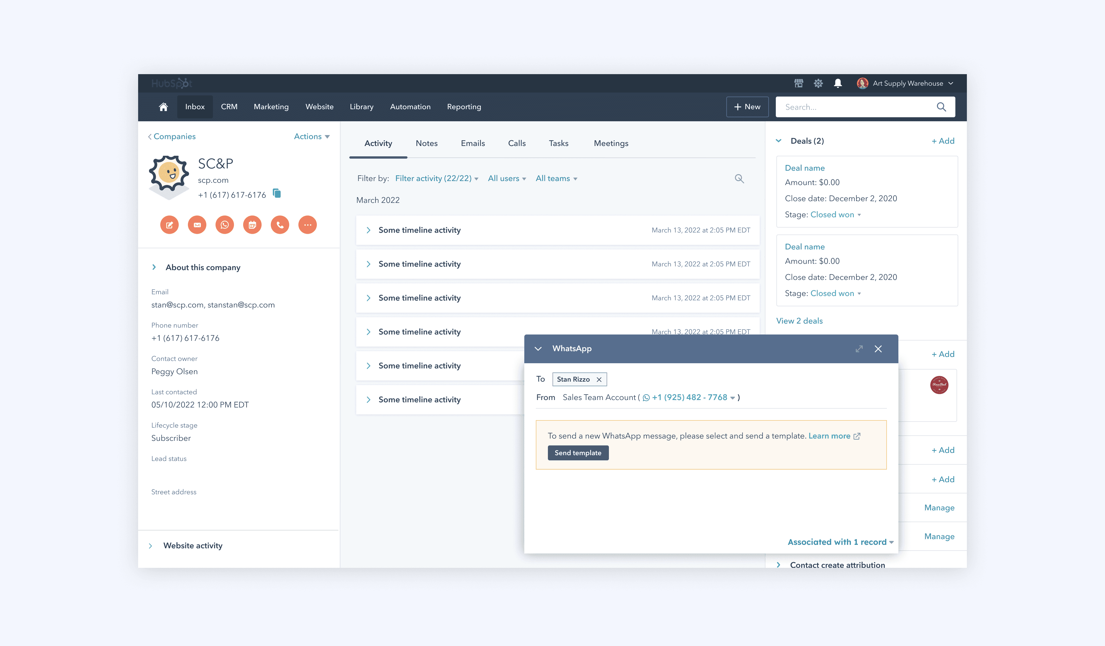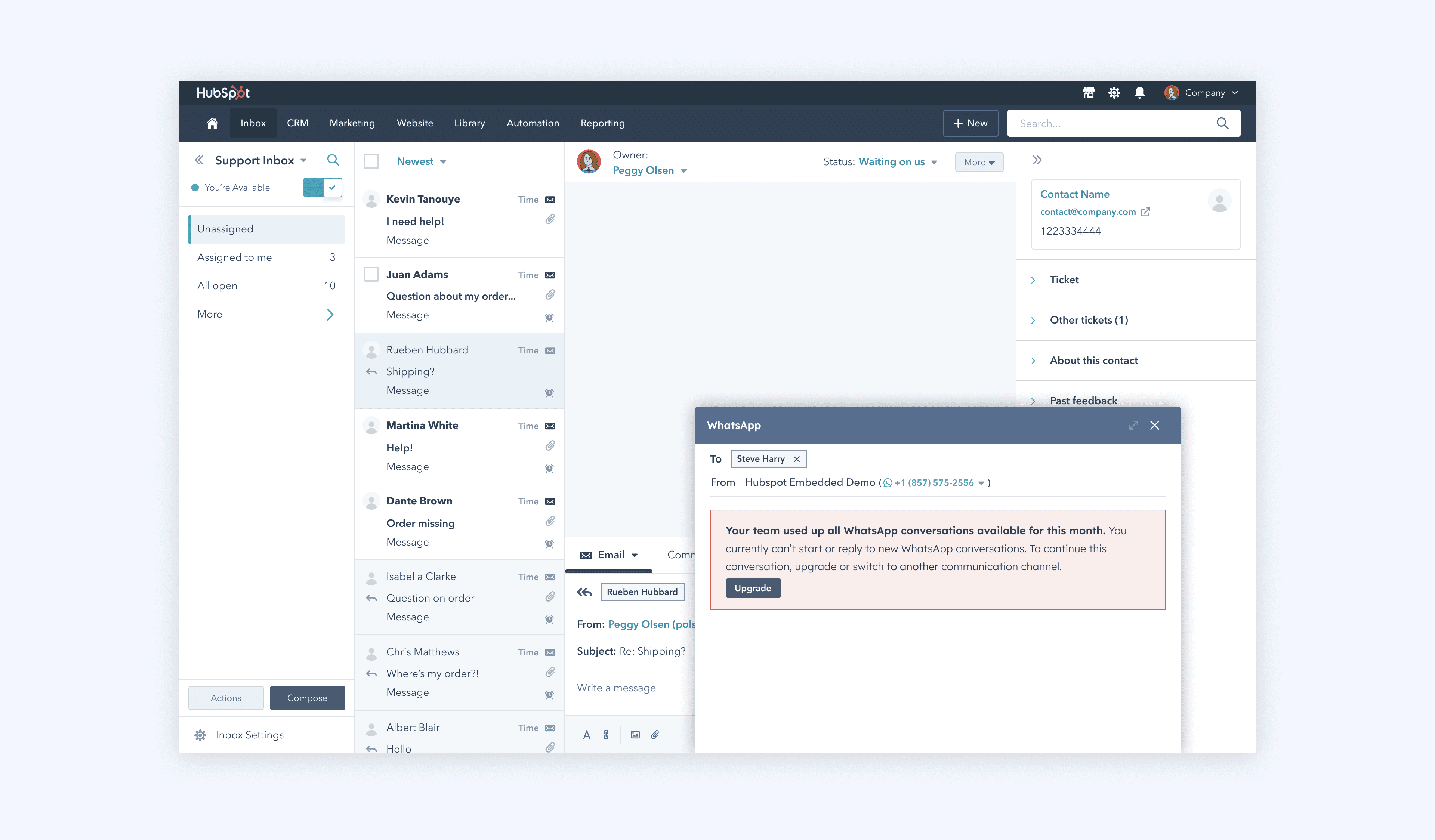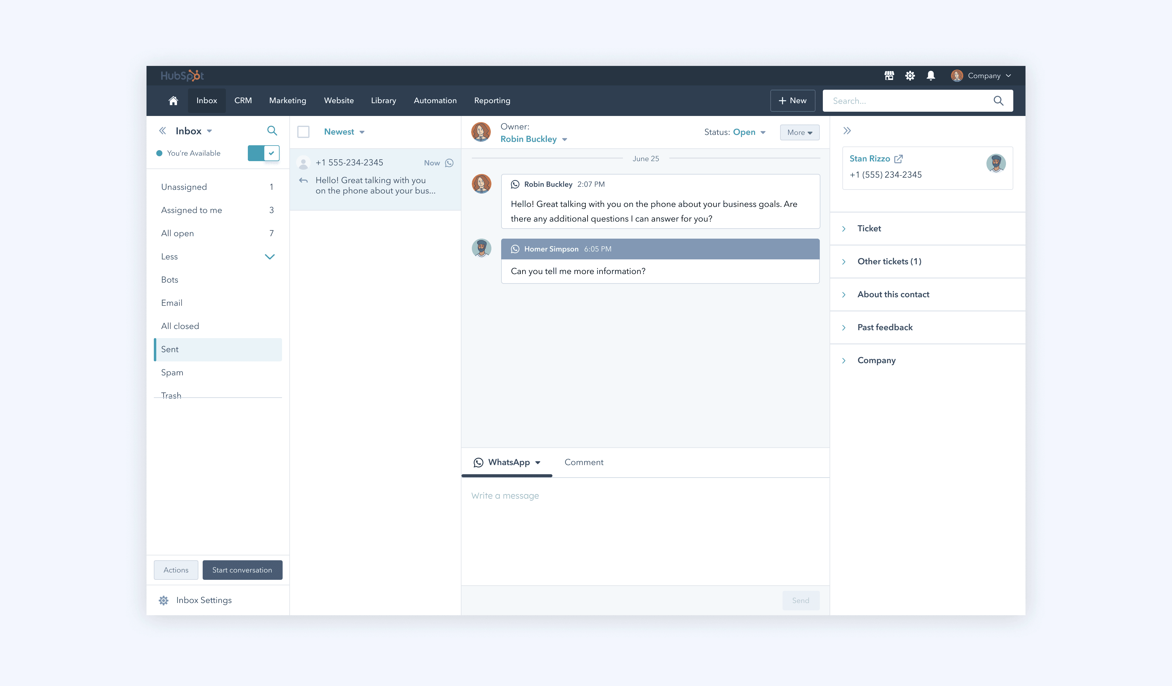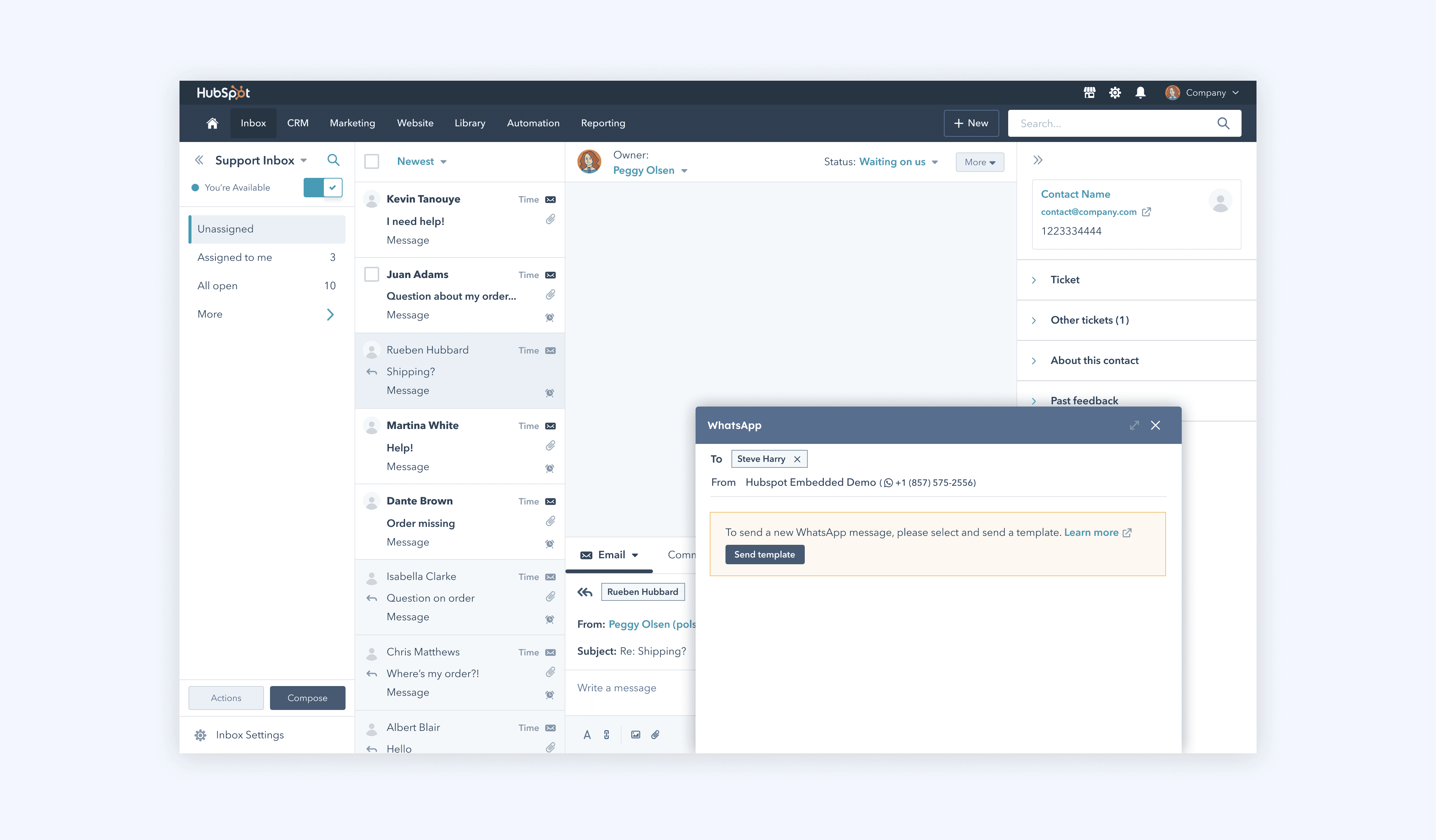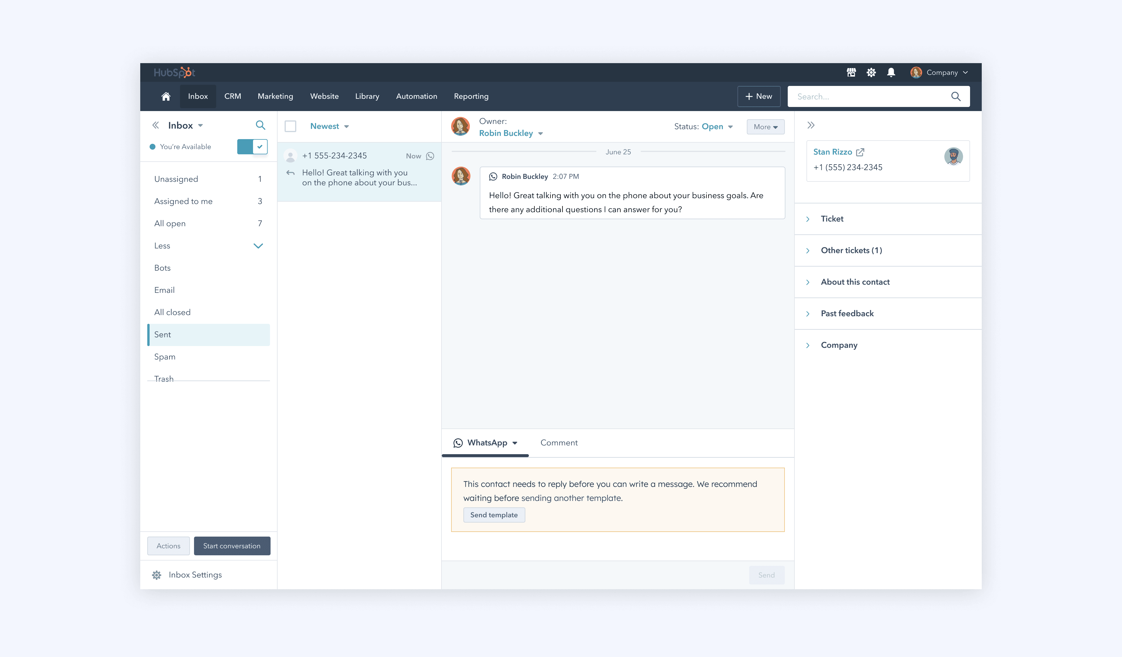 When I joined HubSpot, the team was introducing WhatsApp as a new messaging channel. Unlike existing channels, WhatsApp introduced unique constraints, most notably the requirement to use pre-approved message templates for outbound communication. Businesses couldn’t initiate conversations with free-form messages, which fundamentally changed how outreach worked. This created a design challenge: no other channel within HubSpot followed this model. We needed to integrate WhatsApp seamlessly into both the Inbox and the CRM, two distinct workspaces that supported messaging, while ensuring the experience felt consistent and intuitive across both.