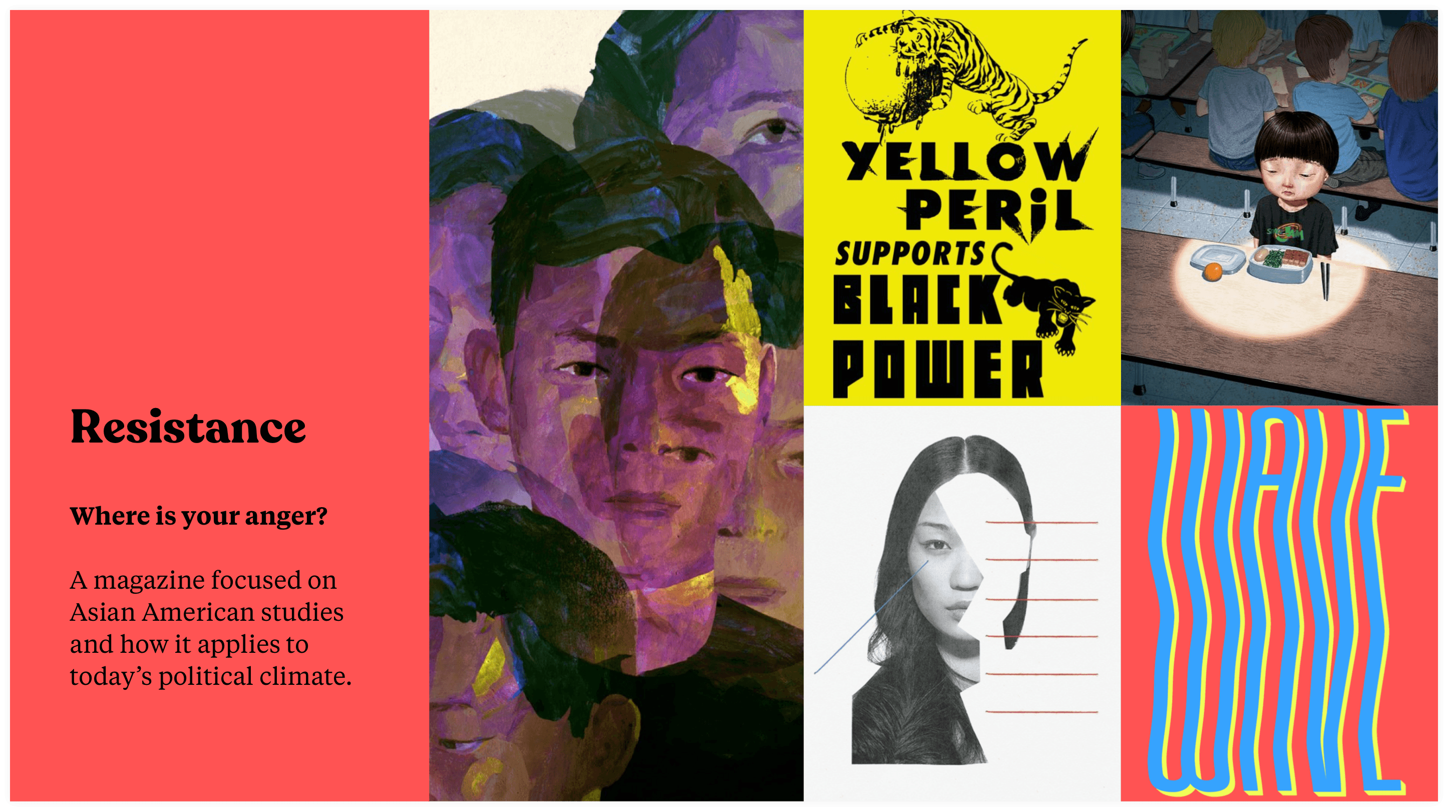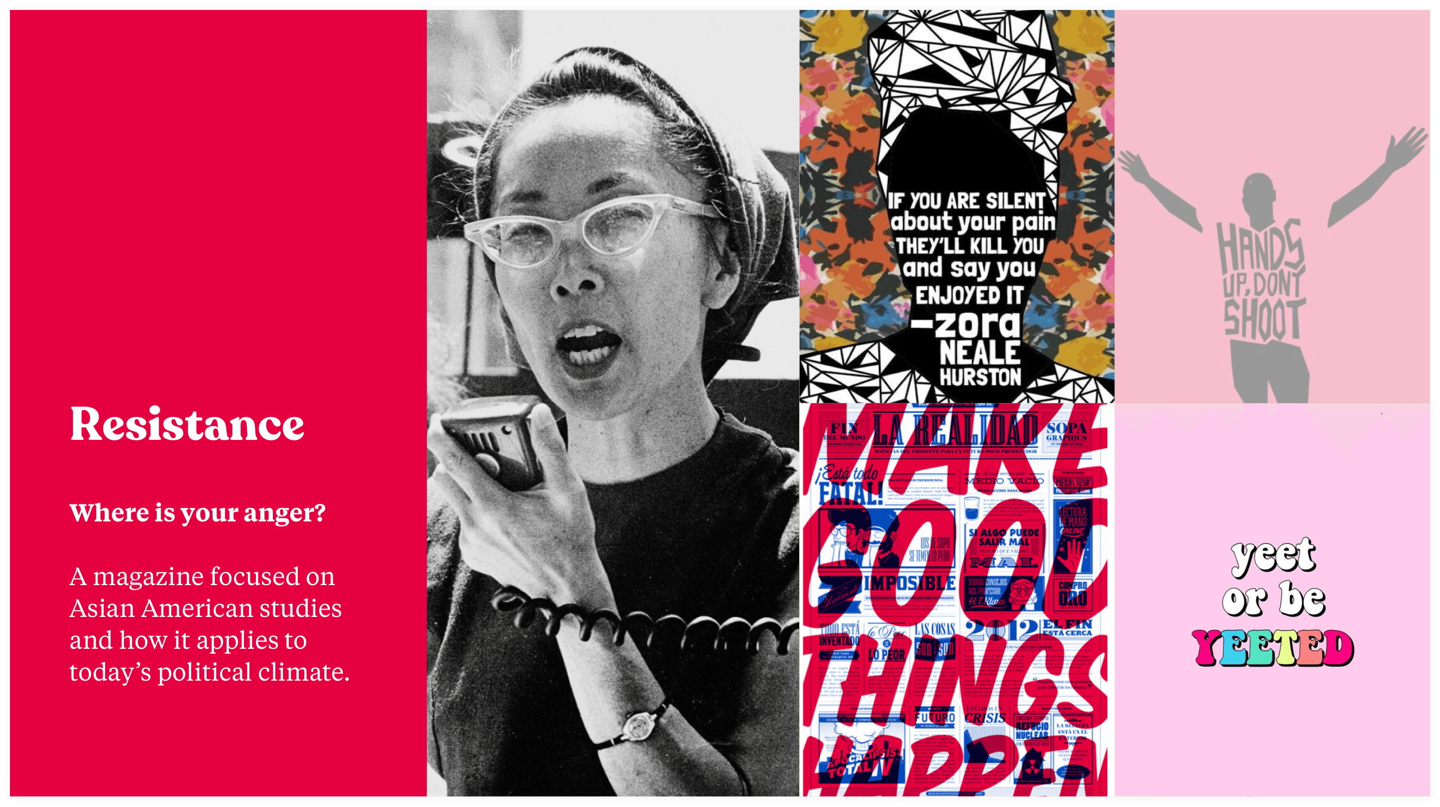 I recently took a course on Stylescapes (similar to mood boards) and decided to apply it to a hypothetical Asian American Studies magazine. Stylescapes use “found” images on the web to help drive high level brand and design directions. I explored three different options, some more bold and bright and others a bit more muted and sad.